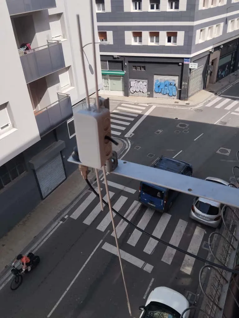 Clon de la popular Sirtel Super Santiago 1200 instalada sobre la barandilla metálica de un balcón.