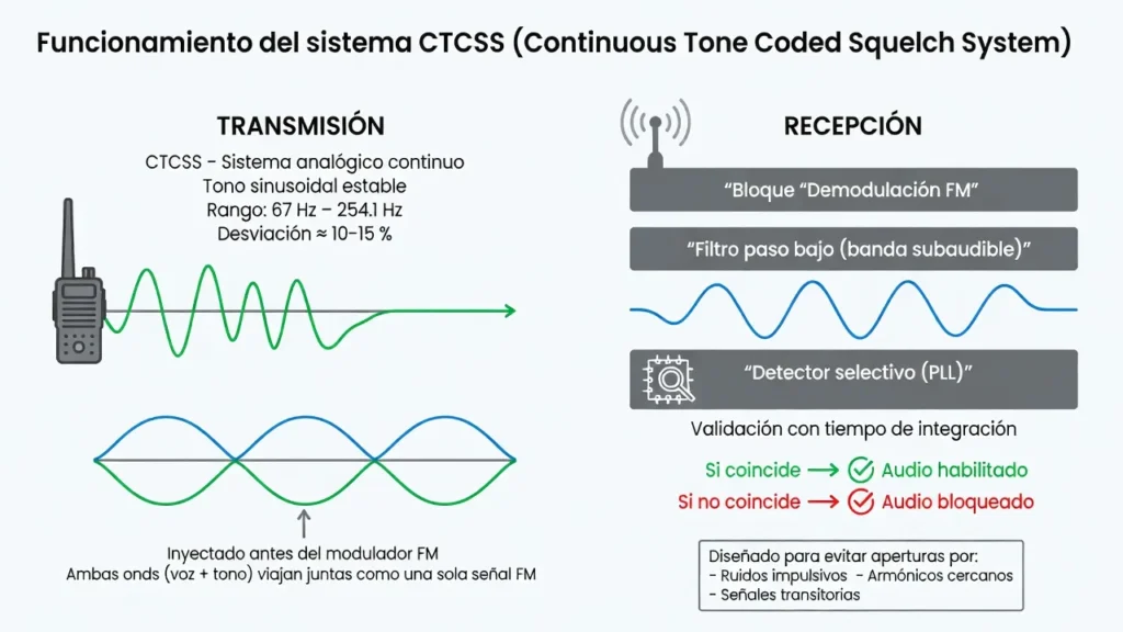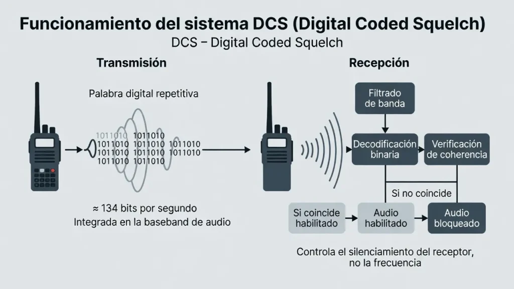 DCS (Digital Coded Squelch) cumple la misma función, pero usando señalización digital.