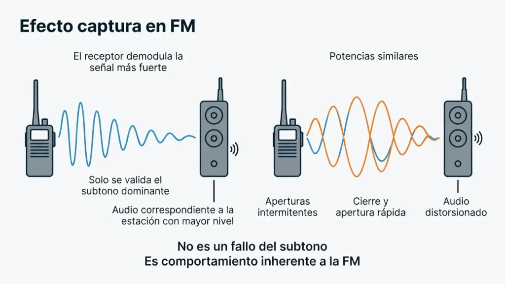 El receptor tenderá a demodular la señal más fuerte cuando dos portadoras están presentes simultáneamente.