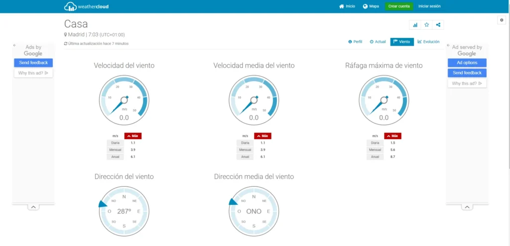 La pestaña «Viento» presenta información detallada sobre las condiciones del viento, mostrando la velocidad actual, velocidad media y ráfaga máxima en metros por segundo, junto con los valores registrados a nivel diario, mensual y anual; además, incluye la dirección del viento y su dirección media expresadas en grados y puntos cardinales, permitiendo conocer con precisión los patrones de viento en la zona.