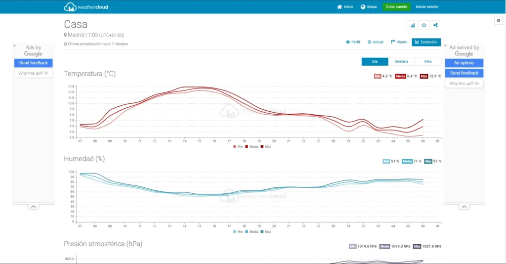 La página «Evolución» ofrece gráficos con la variación de diferentes parámetros climáticos a lo largo del tiempo, como la temperatura con registros mínimos, medios y máximos, la humedad relativa y la presión atmosférica, permitiendo un análisis detallado de las tendencias meteorológicas a nivel diario, semanal o mensual para anticipar cambios en el clima.