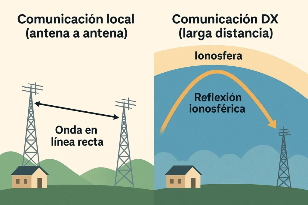 Gracias a la reflexión ionosférica, la señal puede rebotar en la ionosfera y llegar a cientos o miles de kilómetros. Así, es más fácil contactar con Brasil que con la ciudad vecina.