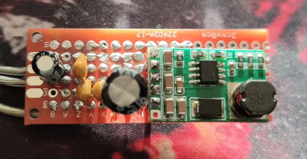 Está compuesto por un conversor DC-DC ajustable y unos condensadores que actúan como estabilizadores y filtros, asegurando que el voltaje sea limpio y constante, sin picos que te fastidien el ESP32.
