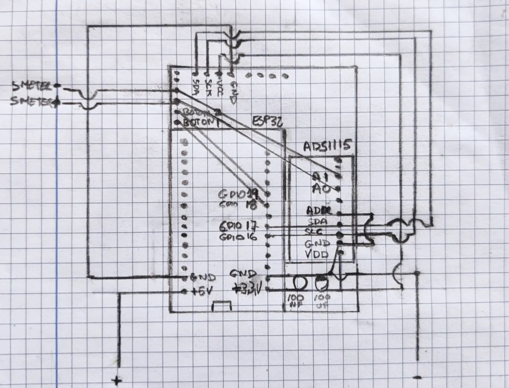 Monté todo en protoboard y empecé con el código. La idea era clara: el ESP32 debía leer el voltaje del S-Meter, interpretarlo y representarlo visualmente en pantalla con una interfaz gráfica.