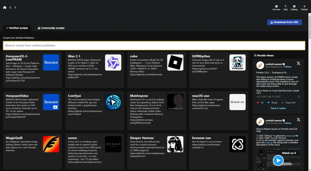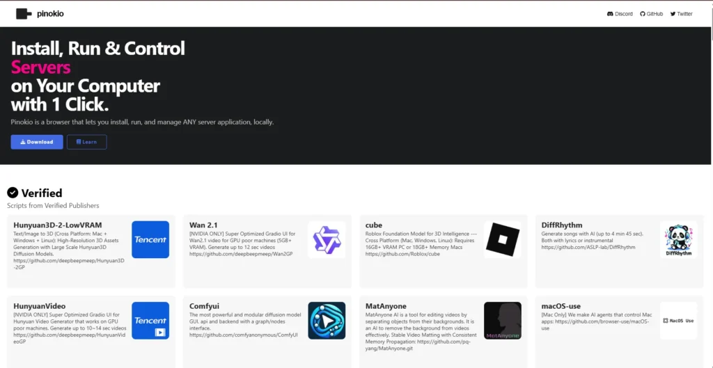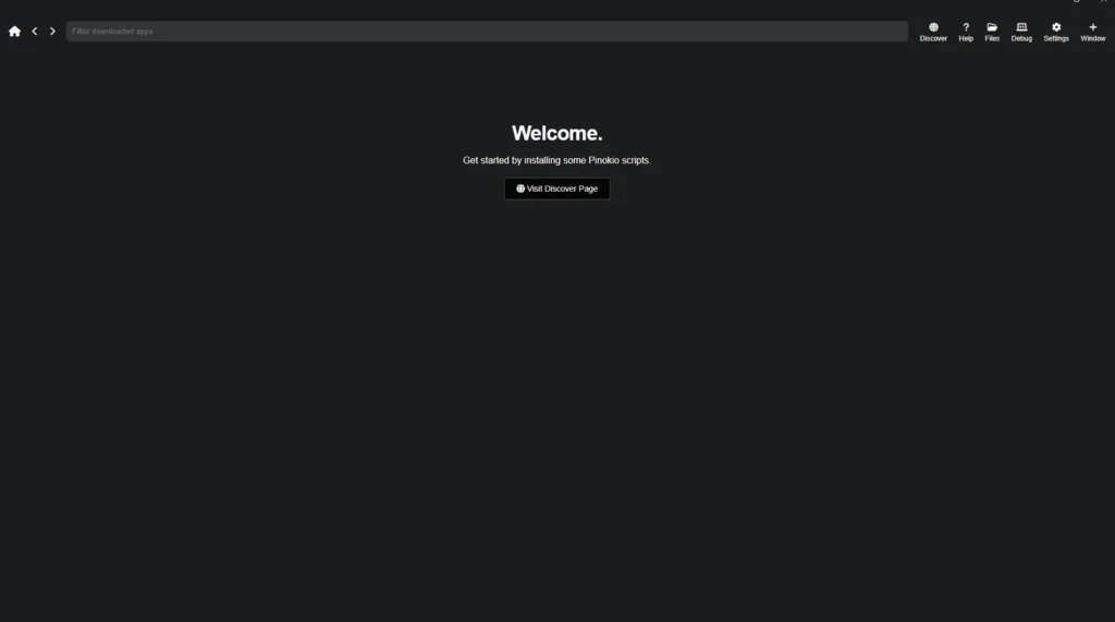 Cuando abres Pinokio verás una interfaz estilo navegador.