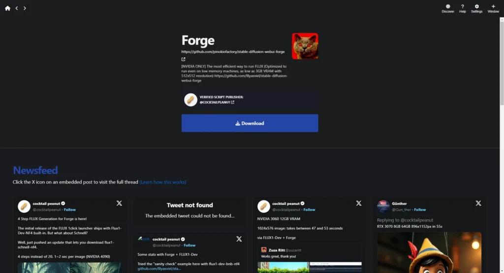 Foocus también está disponible en el marketplace de Pinokio, y es perfecto para quienes tienen GPUs más antiguas o poca RAM. No genera imágenes tan detalladas como Flux, pero para experimentar, hacer pruebas rápidas o simplemente divertirte, es más que suficiente.