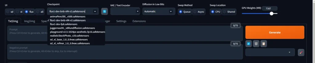 En este menú desplegable selecciona el modelo que quieres usar. Por ejemplo Flux.